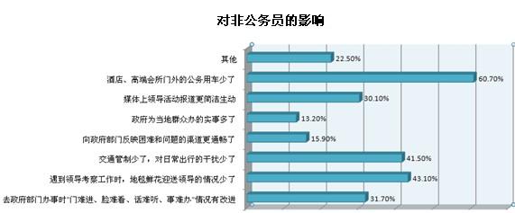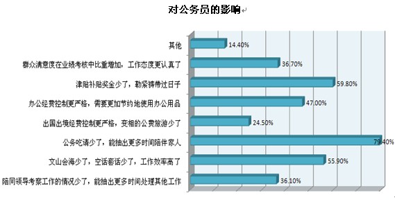 還有三到五成受訪公務(wù)員認(rèn)為“辦公經(jīng)費(fèi)控制更嚴(yán)格,需要更加節(jié)約地使用辦公用品”、“群眾滿(mǎn)意度在業(yè)績(jī)考核中比重增加,工作態(tài)度更認(rèn)真了”和“陪同領(lǐng)導(dǎo)考察工作的情況少了,能抽出更多時(shí)間處理其他工作”是“八項(xiàng)規(guī)定”帶來(lái)的幾大影響。