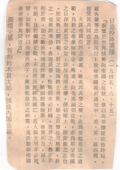 1945年8月15日日本天皇投降廣播詞。這篇文告是告訴自己的老百姓(忠良臣民)的。其中對于發(fā)動戰(zhàn)爭的罪責(zé)不但沒有一個字的自責(zé),而且指“敵使用殘虐炸彈,頻頻殺傷無辜,慘害所及,誠不可測。”和十余年后所發(fā)現(xiàn)的東條英機(jī)遺囑的惡劣態(tài)度如出一轍。廣大網(wǎng)友不放回頭看看2013年12月12日18:21:31《歷史鐵證日本400年侵華野心,讓我們恨搗靖國神社內(nèi)幕吧!》一文中東條英機(jī)的遺囑。