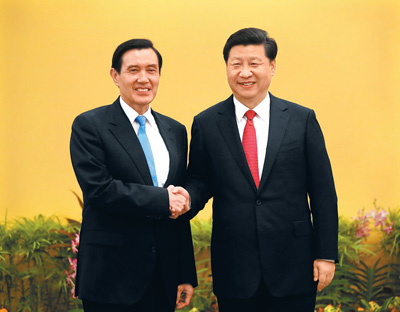 11月7日下午,中共中央總書記、國家主席習近平同臺灣方面領(lǐng)導人馬英九在新加坡會面,就進一步推進兩岸關(guān)系和平發(fā)展交換意見。新華社記者蘭紅光攝