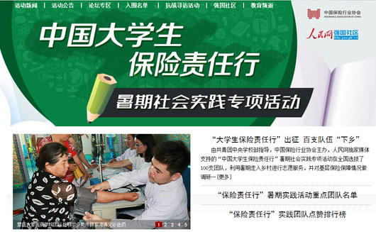 本次活動(dòng)從全國(guó)27個(gè)省市100多所高校選拔出100支入圍團(tuán)隊(duì),在暑期分別以支教、環(huán)保、醫(yī)療、調(diào)研等形式服務(wù)鄉(xiāng)村,提高當(dāng)?shù)鼐用癜踩庾R(shí),提升社會(huì)對(duì)安全教育問題的關(guān)注,同時(shí)開展調(diào)研,了解基層保險(xiǎn)保障相關(guān)情況。各團(tuán)隊(duì)實(shí)踐期間在人民網(wǎng)強(qiáng)國(guó)社區(qū)活動(dòng)專區(qū)實(shí)時(shí)播報(bào)實(shí)踐進(jìn)程,發(fā)回稿件數(shù)千篇。大學(xué)生們積極走入社會(huì)、服務(wù)基層的實(shí)際行動(dòng)贏得50萬網(wǎng)友為他們“點(diǎn)贊”。