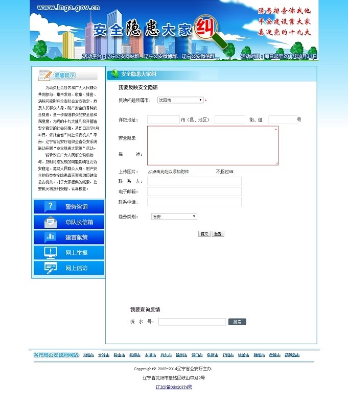 1、直接登錄遼寧省公安廳門戶網(wǎng)站開設(shè)的“安全隱患大家糾”活動專欄(http://www.lnga.gov.cn/ztzl/aqyhdjj/ ),按欄目提示錄入您發(fā)現(xiàn)的安全隱患線索;