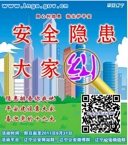為深入貫徹落實(shí)習(xí)近平總書記系列重要講話精神,充分發(fā)揮全省“網(wǎng)上公安機(jī)關(guān)”平臺作用,遼寧省公安廳從即日起至8月31日,組織全省公安機(jī)關(guān)依托各級公安政務(wù)網(wǎng)站、公安政務(wù)微博、公安政務(wù)微信平臺,集中開展“安全隱患大家糾”活動,全面開啟遼寧公安“查患治患”工作的“互聯(lián)網(wǎng)+”模式。