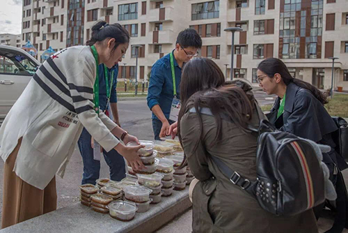 聽(tīng)了介紹,更加渴望見(jiàn)到我們的大廚啦。劉芳總監(jiān)為我們提供了一個(gè)便利,讓我們趁大廚送飯的時(shí)候近距離接觸大廚。隨后我們來(lái)到世博村內(nèi)的送餐地點(diǎn),有幸看到兩位大廚正在給志愿者們分發(fā)盒飯。