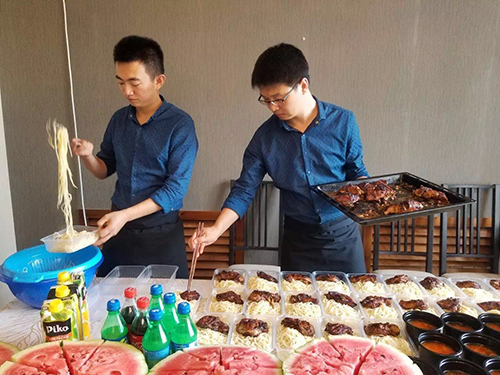 趁著兩位大廚張羅著分發(fā)盒飯的功夫,小編趕緊跟大廚交流起來(lái)。這兩位大廚分別是劉會(huì)彬和高德發(fā),都是名副其實(shí)的“90后”,別看年輕,兩位大廚的廚藝精湛,參與保障過(guò)青島國(guó)際啤酒節(jié)、國(guó)際象棋大賽等國(guó)際節(jié)慶活動(dòng)及賽事。