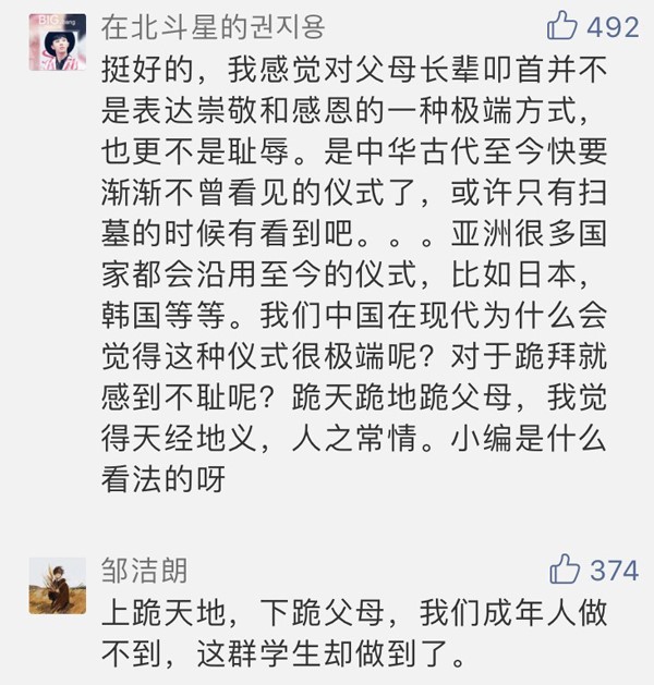 此類“跪拜感恩儀式”此前也多次見諸媒體。有人認(rèn)為憑借“跪拜父母”這樣一個(gè)古樸而鄭重的形式,可以倡導(dǎo)日益淡薄的感恩文化回歸,也有網(wǎng)友認(rèn)為“孝道在心,不在做秀”,或從人格養(yǎng)成方面評論:“跪拜禮抹殺了獨(dú)立人格”。